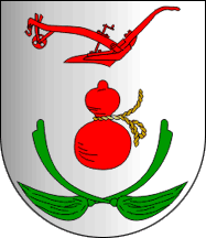 Shield Argent a gourd Gules cordoned Or, in chief a plough Gules, in base two Montpellier brooms Vert arrayed in saltire.