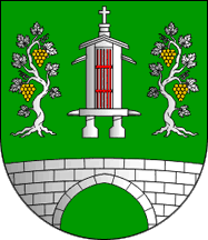 Shield Vert a raised granary Argent grated Gules, flanked by two grapevines Argent fructed Or, issuant from base a hump bridge Argent masoned Sable.
