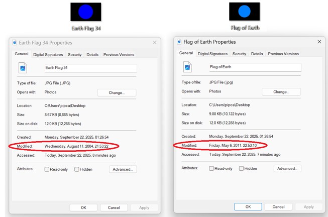 A vector image I submitted this year to Wikimedia Commons, with the file name Common Earth Flag, is mentioned on [FOTW] website, as being "allegedly created in 2011". I wanted to clarify that the reason I hadn't published my kindred version of the pale blue dot flag before this year is that the design seems so... well, common (hence the name I chose). It's essentially James Cadle's Flag of Earth without the Sun and Moon included. Seeing Erik Kennedy's 2009 version recently reminded me that I too had created one long ago. I felt he didn't have the proportions and color quite right, and so I finally published my version this year. For whatever it might be worth, I came up with the idea of a black flag with a blue disc as an earth flag back in 2004, and the one with a light-blue disc in 2011. Neither was published at the time, which means, of course, they don't count. However, I'm quite sure I wasn't the first person to think of putting a blue disc on a black flag and calling it an earth flag. If Erik Kennedy and I thought of it independently, many others surely did too and likely earlier than 2004. (I've attached to this email a screenshot documenting the dates of last modification, for my 2004 blue-disc version and its 2011 light-blue-disc refinement published this year.) Thank you for your indulgence in letting me clarify.