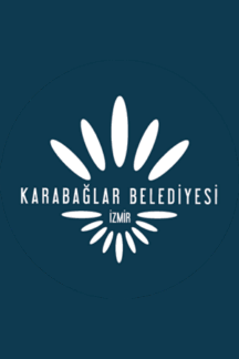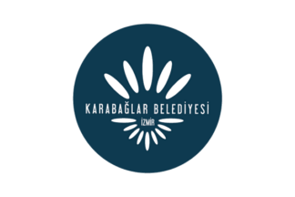 The flag of Karabağlar (photo, photo), also used vertically (photo), is white with the municipality's emblem. The vertical flag is also used with a blue background (photo). "Belediyesi" means "Municipality".