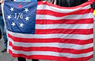A pro-Trump flag with a blue-canton with 1 red star (representing "January") and 6 white stars (representing the "6th" day of January) all of which [1/6] refer to January 6, 2021, when the U.S. Electoral College cast a majority of votes in electing Joeseph Biden over Donald Trump to be inaugurated as the next U.S. president -- just a few days later on Jan. 20, 2021. Thereby, then-Pres. Trump failed in seeking re-election to a second four-year term. Then-Pres. Trump urged his followers to dispute the then on-going Electoral College voting, which while causing a riot and invasion of the U.S. Capitol building (where the Electoral College was meeting), failed to thwart the E.C. from eventually electing Biden as president. This activity is referred to as part of the "STOP THE STEAL" movement, when Pres. Trump claimed that his opponents were trying to "steal" the election by overcounting "fake" pro-Biden election votes/ballots . This pro-Trump flag honors the pro-Trump demonstrators/rioters who failed to thwart the proceedings of the E.C. on Jan. 6, 2021. This flag was seen being paraded by pro-Trump supporters in Washington, DC, on the 5th anniversary [Jan. 6, 2026] of the E.C.'s election of Biden over Trump.