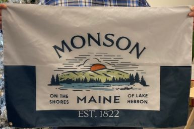The winning design was created by Ryan Austie, the flag shows a horizontal bi color of an off-white color and dark blue. In the center shows the sun rising over a mountain. At the base is Lake Hebron. At the bottom is the slogan "On the Shores of Lake Hebron," with the state name and the town's establishment year.