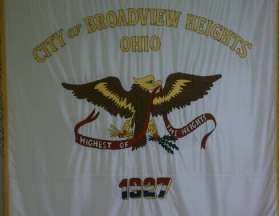 The Broadview Heights flag consists of a white background with a bald eagle in the center, colored with gold skin and brown feathers. It holds a set of arrows in it's right hand, and an olive branch in it's left, similar to the United States coat of arms. In it's mouth is a red ribbon that says "HIGHEST OF THE HEIGHTS". Above the eagle is text that says "CITY OF BROADVIEW HEIGHTS OHIO", and below the eagle says "1927", striped in red, white and blue with a yellow drop shadow.