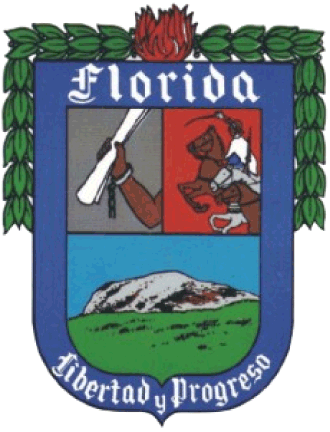 The coat of arms was approved on 10 July 1939, designed by Juan Antonio Cabrera. Its graphic model was created by Manuel Rosé. It is a shield with a blue border, reading at its top Florida in white; at the bottom the motto Libertad y Progreso [Liberty and Progress], all in white and a Gothic font. The inner area is divided into three sections, two in the upper half. The upper-left section depicts a hand with broken chains for liberty, holding the Act of Independence signed on 25 August 1825 in Florida. The upper-right section depicts three horses and a horse rider carrying a sword and rifle to the side, referencing the fight for independence at the Battle of Sarandí under Juan Antonio Lavalleja, who reportedly said there, "Rifle to the side and saber to the hand" (translated). The lower section depicts the Piedra Alta above the grass, recognizing the site where the Declaration of Independence was given by the Congress of Florida. Above the shield, two branches of laurel for grace hang downward, separated by a flame for the glory of the heroes.