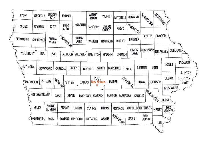 Ciudad Capital: Des Moines (se pronuncia Des-Mó-iins en ambos idiomas) Fundado en la confluencia