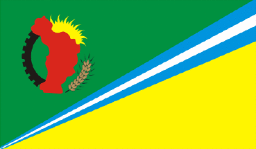 half-gearwheel, a yellow rising sun and a golden yellow rice panicle.