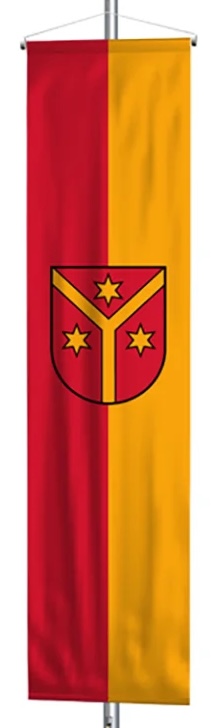 images located by Martin KarnerThe arms show a yellow/golden upright pall on red, with a six-pointed star in each of the three fields.