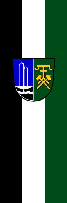 | Description of arms (German): | Gespaltener Schild. Vorn in Blau über schwarzem Fuß ein silberner Springbrunnen: Aus einer silbernen, durch eine zweiwurzelige silberne Wasserader gespeisten Brunnenschale, deren Oberkante die Teilungslinie bildet, steigt senkrecht ein silberner Wasserstrahl auf, der in der Höhe nach links und dann nach rechts gespalten und wieder rückläufig ist. Hinten in Grün ein goldenes Bleizeichen, dessen Schenkel von einem goldenen Bergmannzeichen überlegt sind. [1] [2] |