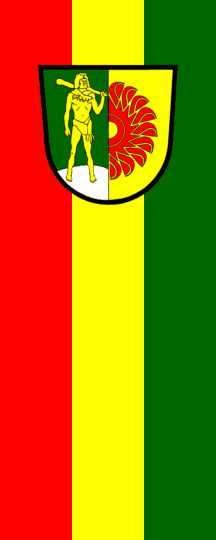 | Description of arms (German): | Gespaltener Schild; vorn in Grün auf silbernem Berg ein goldener Herkules mit Löwenhaut und Keule, hinten in Gold ein halbes rotes Peltonrad am Spalt. [1] [2] |