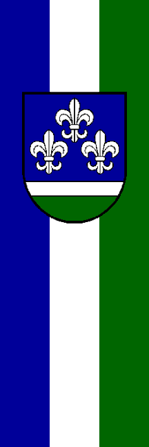 | Description of arms (German): | Durch eine erniedrigte, silberne Leiste geteilt; oben in Blau drei silberne, 1:2 gestellte heraldische Lilien; unten Grün. |