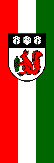 | Description of arms (German): | Unter schwarzem Schildhaupt, darin drei silberne Würfel nebeneinander, von denen jeder oben ein schwarzes Auge, rechts zwei und links vier schwarze Augen zeigt, in Silber ein rotes, auf seinen Hinterläufen sitzendes Eichhörnchen, das einen grünen Tannenzapfen mit den Vorderpfoten vor sich hält. |