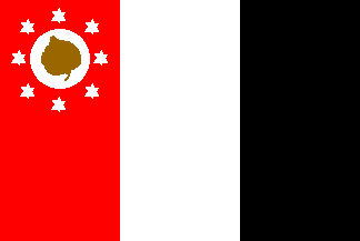 The flag of Murray Island is made of three vertical stripes, red-white-black.In canton, a brown leaf is placed in a white disk. Eight white six-pointed stars surround the disk. A simplified version of the Murray Island flag, without the emblem in canton, was also seen during the ceremony.