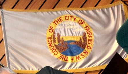 The flag of the Fairfield City Council is white with the city council badge