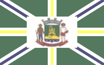 A dark green flag with a vertical cross with yellow central stripes, and a diagonal white cross with blue central stripes, and white rectangle in the centre with the municipal arms.