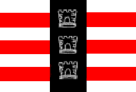 Seven horizontal stripes, white and red, overlain by a central black bar bearing three mural crowns.