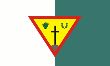 Vertically divided white and blue-green, with a large red-edged yellow triangle, centerd, bearing local symbols.