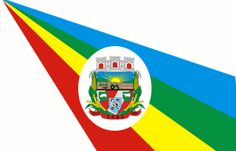 A white flag with four rays radiating from the upper hoist, blue, green, yellow, red, and the municipal shield in the centre in white oval.