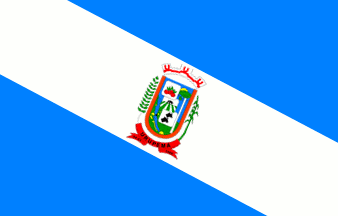A white bend on a blue, with the municipal arms in the centre, tilted on to the bend.