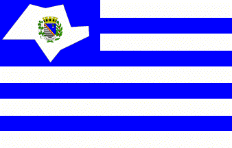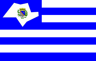 Nine white and blue horizontal stripes and a blue canton four stripes deep bearing the municipal arms in a white stylized shape of the state of São Paulo.