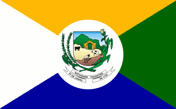 Divided per saltire, white to the hoist, deep yellow above, green to the fly, blue below, with the municipal arms on a white disk in the centre.