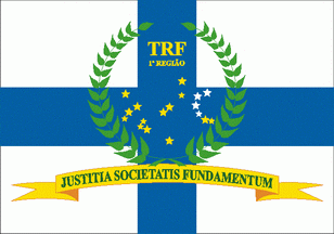 An upright blue cross on white, overlain by a garland and constellation of stars in gold and white a ribbon bearing the motto and the words TRF 1a REGIÃO.
