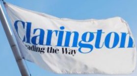 The flag of the Municipality of Clarington, Ontario, is white with the municipal logo on it. The logo is just lettering "Clarington (in blue) / Leading the Way (in black)".