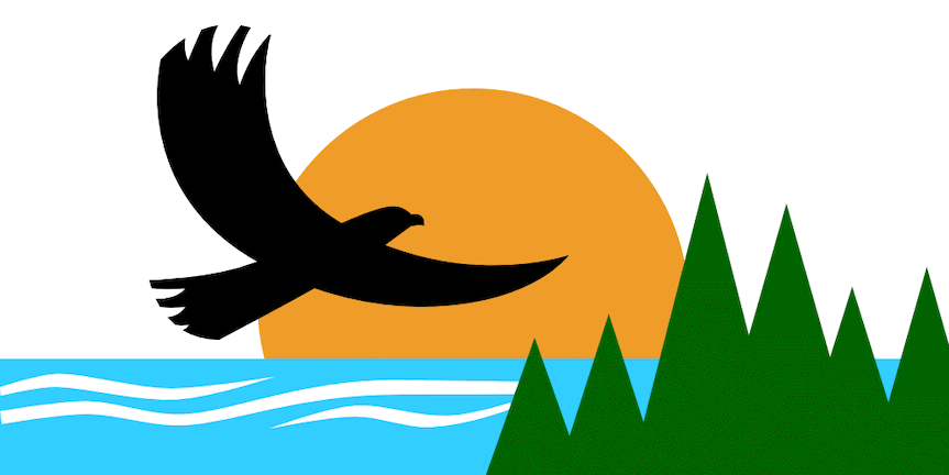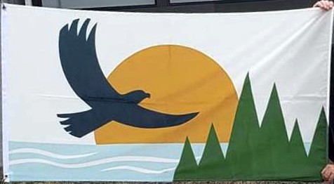 The flag depicts a local scene of a black raven(?) flying in front of a setting sun over a blue lake with six schematic trees in the lower fly.