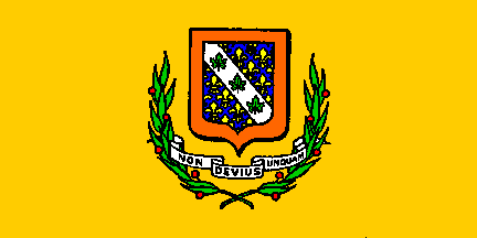 This is the municipal flag of Anjou (Quebec), a town located in eastern Montreal island [where I grew up!]. It's an orange-gold field with the arms : Anjou ancient defaced with a white band with three green maple leaves, plus motto of duke Gaston d'Anjou NON DEVIUS UNQUAM under the shield and laurel leaves surrounding it.