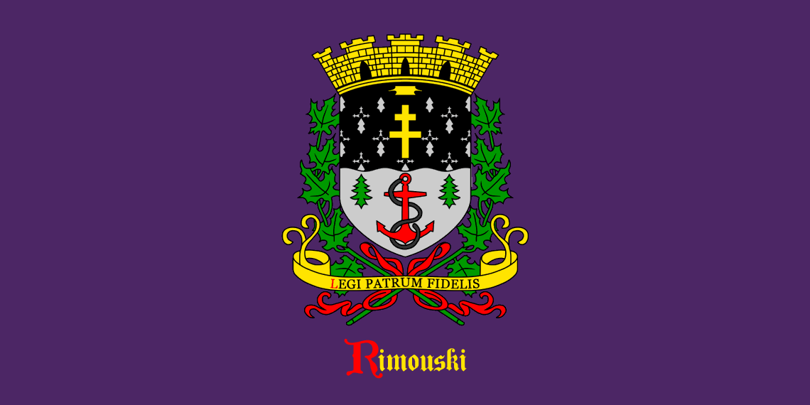 The flag of the City of Rimouski has a purple field with the city’s coat of arms in the centre. Rimouski runs below the arms in a medieval font; its “R” is red, the other letters are yellow.
