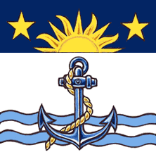 Azure fouled Or, on a chief Azure a sun rising between two mullets Or;