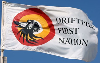 The flag of Driftpile Cree Nation consists of the Nation's emblem on the white background, positioned towards the hoist, and black lettering "DRIFTPILE / FIRST / NATION" on the rest of the flag. It can be seen on a photo at: http://www.driftpilecreenation.com.