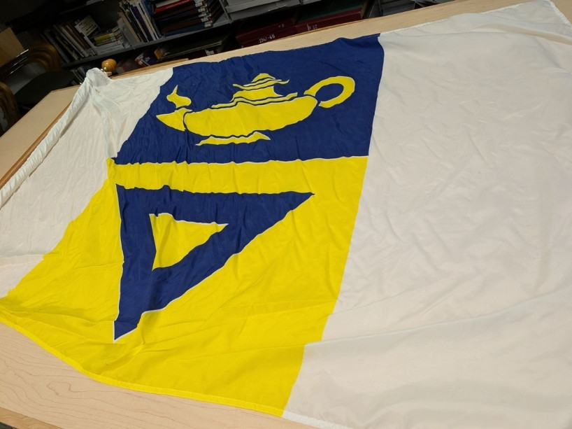 The original university flag, created in 1972, is white, blue and gold with an image of the previous crest that shows the lamp of learning in gold and triangle in blue.