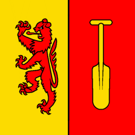 Per pale Gules and Or a lion rampant of the Second and an oar palewise of the First.