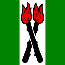 Vert on a Pale Argent two Torches ragully flambant Gules in Saltire.