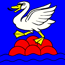 Azure, a Swan passant on Coupeaux of Six Gules issuant from two Filets wavy Sable.