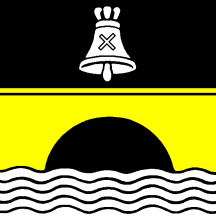 Sable a bridge Or over a base wavy Argent surmounted by five barrulets wavy of the First and in chief a