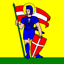 Or on a base Vert St. Maurice Proper harnysed Azure with nimbus of the First holding in dexter a spear Brunatre showing a gonfanon Gules with cross throughout Argent and in sinister a shield of the Same.