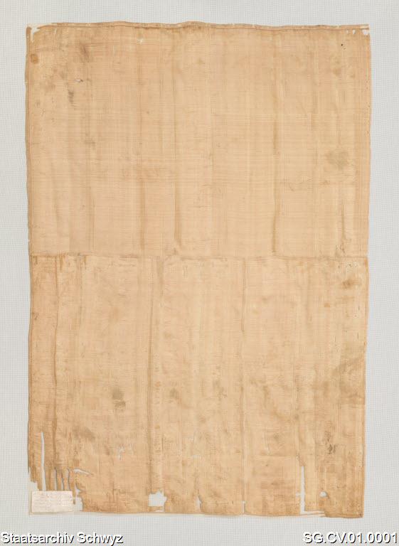 Julius Banner (1512), dedicated from pope Julius II to Schwyz for their support in the Pavia campaign. Inscription (Latin): "The Blessed Mother, her scion and the keys were given to them [the people of Schwyz] because they had been defenders of the Holy Mother, the Church. In the year of the Incarnation 1512, under the reign of [pope] Julius II" (source).