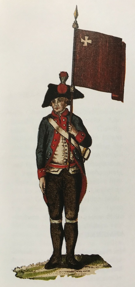 Officer Designate (flagbearer) of Schwyz (end of 18th c.). An early example of the flag with the white cross in the canton (source).