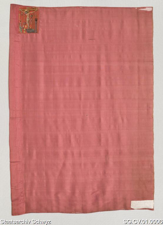 "The banner of Canton Schwyz has been a rectangular red silk cloth since the later 13th century. [...] The evidence is that the Schwyz banner has had a corner image (Zwickelbild) since the 14th century, even though the oldest surviving example dates from after the Burgundian Wars (symbolic picture). This corner district is mentioned in writing by Conrad Justinger and in the Bern city chronicle (both around 1420). It is depicted in the drawing of the Battle of Morgarten in the Tschachtlan Chronicle (around 1470). Schwyz received a banner privilege from Pope Sixtus IV in 1479, which gave the right to depict the crucifixion scene in the corner quarter.