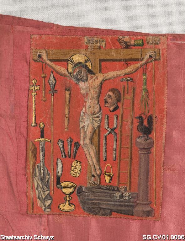 "The oldest surviving Schwyz flag, simply red without any symbols, was carried at the Battle of Morgarten in 1315! A little later, but at the latest in the last third of the 15th century, a small religious image was attached to this red flag on the upper side of the pole. Such signs are also called corner quarters or spandrels. The oldest surviving corner district of Schwyz consists of a piece of painted leather sewn onto a red flag that can be proven to have been carried during the Burgundian wars of 1474–1477. This corner quarter shows Jesus crucified with the instruments of torture, a motif called the Arma Christi. The Swiss pictorial chronicles of the 15th century sometimes show a sketchy form of this corner quarter with a simple cross and two small dashes, a motif which is also called Heilig Rych, but actually has the same origin. This picture shows a creation based on these old Schwyz flags in a simplified form. A status disc from 1501 shows the red Schwyz banner with black corner quarters and a golden cross with instruments of torture. In 1512, Pope Julius II presented the Confederates and their allies with precious flags, the so-called Julius Banners, out of gratitude for their military help: The one from the state of Schwyz has been preserved and has a black corner quarter with the crucified Christ and the instruments of torture as well as the papal keys in gold. As a basis for the design of the old Schwyz flag, the color pattern of the state disc and that of this famous banner were used (picture).