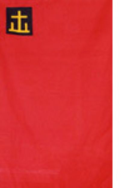 On a red field, a small white cross with long narrow arms in the top corner of the hoist.
