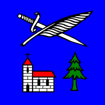 Azure a sword downpointing and a palm in saltire and in base a church of the same roofed gules and a