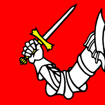 Gules an arm issuant from dexter armoured argent embowed holding a sword hilted and pommed or.