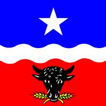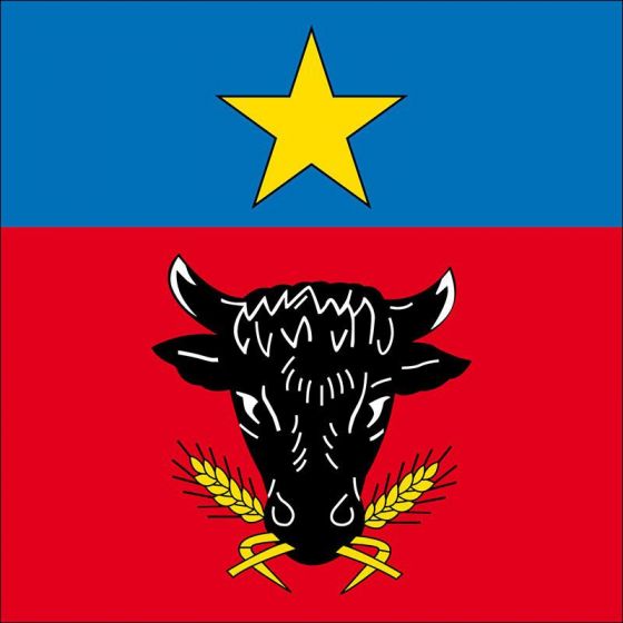 Gules, an ox head guardant Sable holding two ears of grain Or in the mouth a chief Azure bearing a