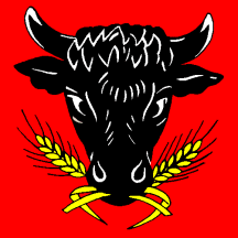 Gules, an Ox head guardant Sable holding two Ears of grain Or in mouth.