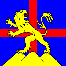 Azure a cross throughout Gules surmounted a triple-mount Or a lion rampant regardant of the Same