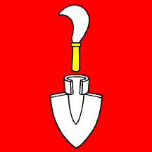 Gules in chief a Sickle Argent handled Or and in base a Ploughshare Argent.