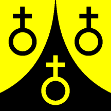 Per chevron rised embowed Or and Sable overall three Earth Symbols two and one counterchanged.