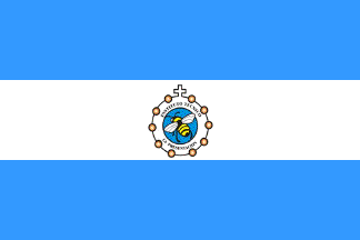 The flag is horizontally divided celestial blue-white, with the institute's coat of arms, tilted to the upper hoist and inscribed on a white disk surrounded by a red border inscribed with the institute's name and place in white letters. Celestial blue, the colour of the cloak of the blessed Virgin, is a symbol of serenity, while white is a symbol of peace.